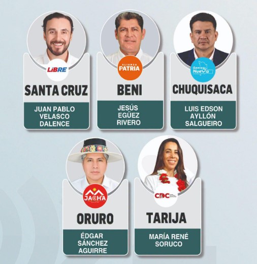 Las cifras proyectan como autoridades electas a Juan Pablo Velasco en Santa Cruz, Jesús Egüez en Beni, María René Soruco en Tarija, Édgar Sánchez en Oruro y Luis Ayllón en Chuquisaca. Los resultados están respaldados por actas verificadas y un volumen de conteo suficiente para sostener la estabilidad de las diferencias.