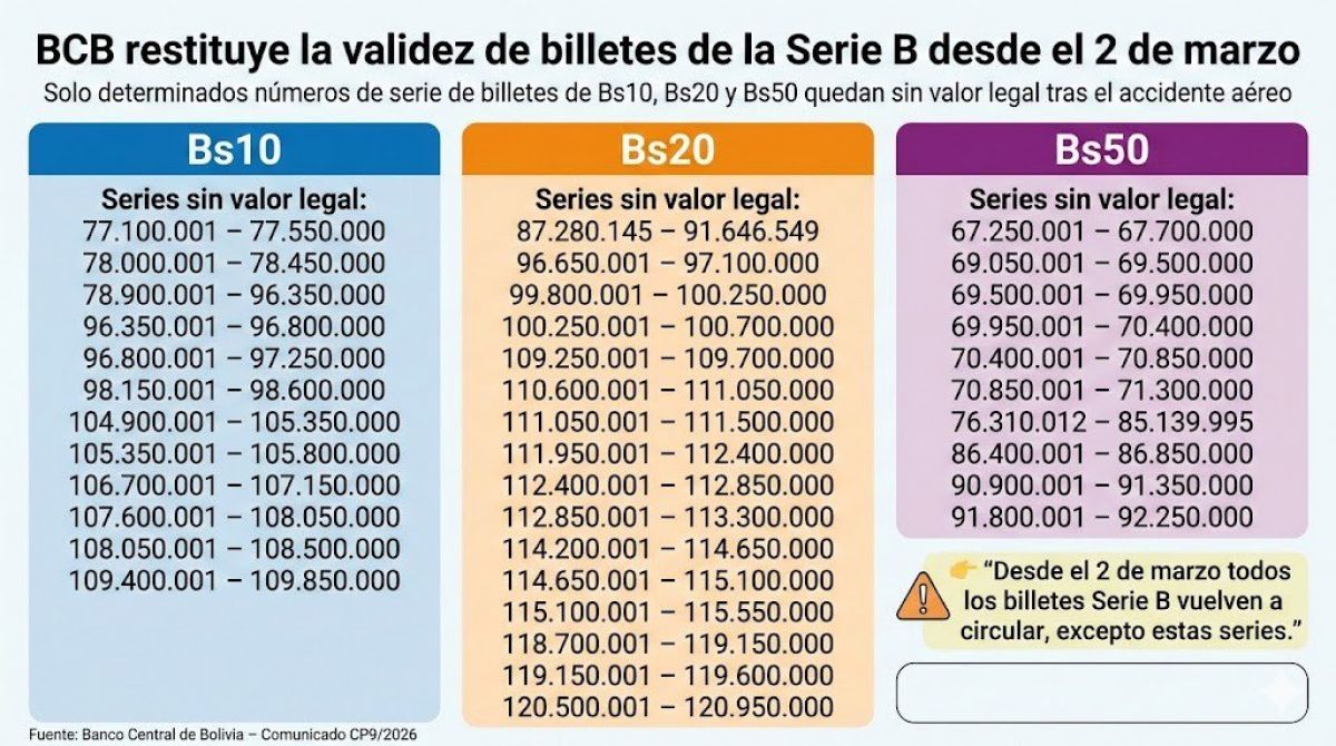 La suspensión que dejó en pausa el uso de los billetes de 10, 20 y 50 bolivianos de la Serie B quedan sin efecto este lunes 2 de marzo. El Banco Central de Bolivia (BCB) informó oficialmente que esas piezas vuelven a ser aceptadas con total validez legal, luego de completar el proceso de verificación activado tras el accidente aéreo registrado el viernes 27 de febrero.