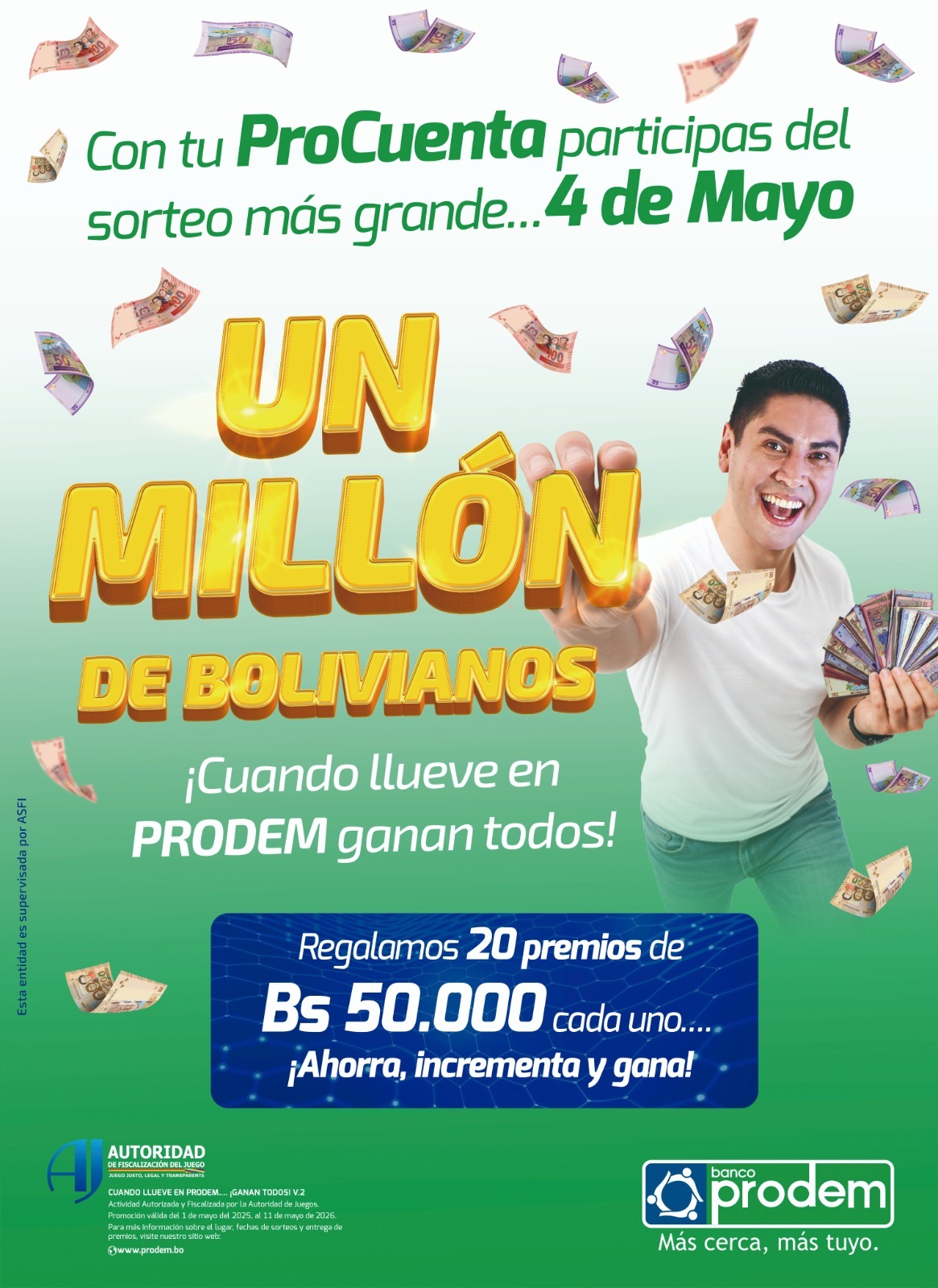 Este 4 de mayo de 2026, se realizará el cierre oficial de la segunda versión de su promoción con la entrega de un millón de bolivianos, distribuidos en 20 premios de 50.000 bolivianos cada uno. El sorteo será transmitido en plataformas digitales de Banco Prodem y por medio de ATB Digital, con la intención de llegar a la mayor cantidad de personas para que evidencien la transparencia del sorteo.
